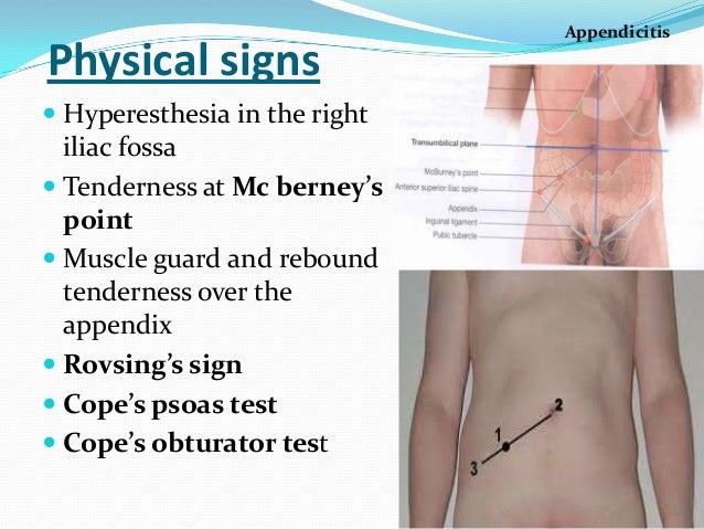 The appendix is a small pouch in the abdomen. Related information on australian websites. If you go to the emergency room and are sent home without treatment, make sure you return to be reexamined if the symptoms worsen. You will not have to make any changes in your diet or lifestyle. A ruptured appendix can be fatal. Health care professionals can diagnose most cases of appendicitis by taking your medical history, performing a physical exam, and through an imaging test. Appendicitis is the most common cause of emergency abdominal surgery in children. Anorexia, diahrrea or constip., tachycard., rapid shallow breath, pallor, lethargy. In this video we describe and demonstrate the physical exam tests that can be performed at the bedside to help us figure out if a patient is at risk for. If you suspect you have appendicitis, see your doctor or go to an emergency department. Expect a few weeks of recovery from an appendectomy, or longer if your appendix burst. People with appendicitis will need surgery to remove the appendix, called an appendectomy. What tests work if you have silent appendicitis?